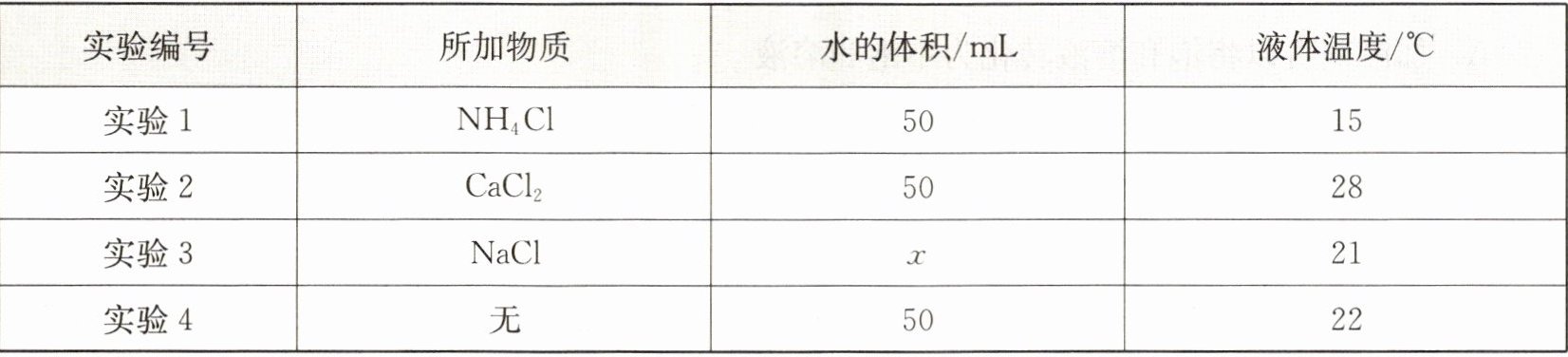 三种物质各取 1 药匙分别置于不同的烧杯中,均用水溶解。在第四个烧杯中加入水。用温度计测量液体温度,记录有关数据如下表所示。