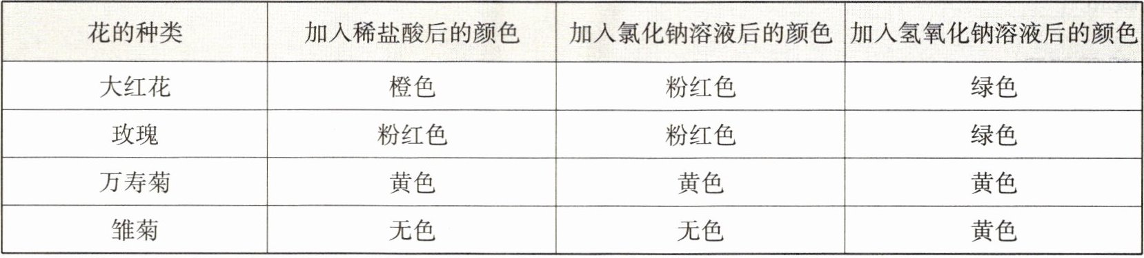 小组成员选择了实验室中的三种溶液,将花的汁液滴入其中进行检验,结果如下表所示。