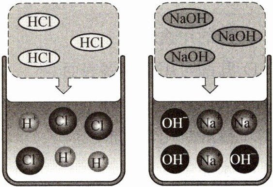 8. (1) 右图是HCl和NaOH在水中的微观粒子示意图,分析两图可知,盐酸和氢氧化钠溶液具有导电性的原因是它们在水中会离解出