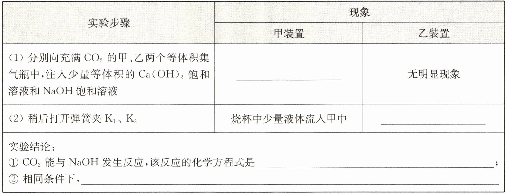10. 为了研究二氧化碳与氢氧化钙溶液、氢氧化钠溶液的反应情况,某化学社团同学进行了如下图所示实验(装置气密性良好)。请补全表格中的空格。
