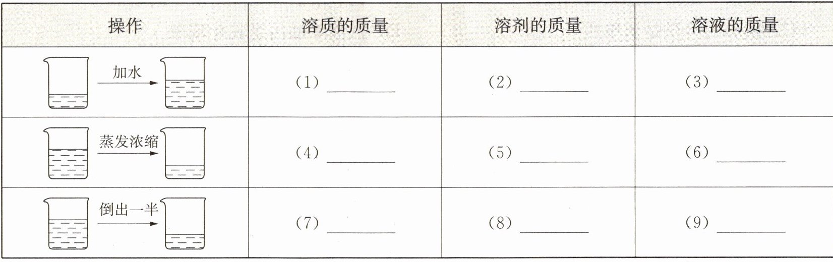 10. 分析对蔗糖溶液进行以下操作后溶质、溶剂和溶液的质量的变化,将变化情况填入下表(填“变大”“变小”或“不变”)。