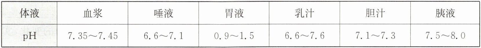 5. 人体部分体液的正常 pH 范围如下表所示,下列说法中正确的是(