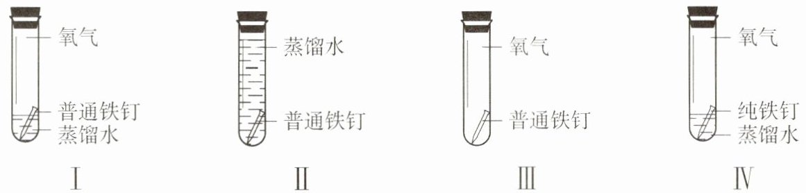 4. 为了探究铁制品生锈的条件,小明用普通铁钉、纯铁钉同时进行下图所示的四组实验,一段时间后只在实验Ⅰ中观察到了红褐色锈斑,其他均无明显变化。下列说法中错误的是(