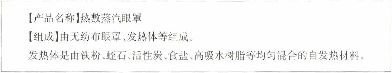 8. 蒸汽眼罩是我们日常生活中常见的缓解眼睛疲劳的产品,简单实用。某化学兴趣小组的同学根据产品标签中的部分信息对蒸汽眼罩开展了以下研究。