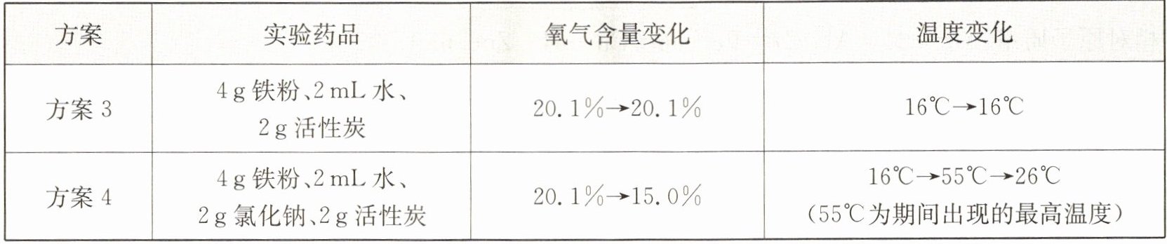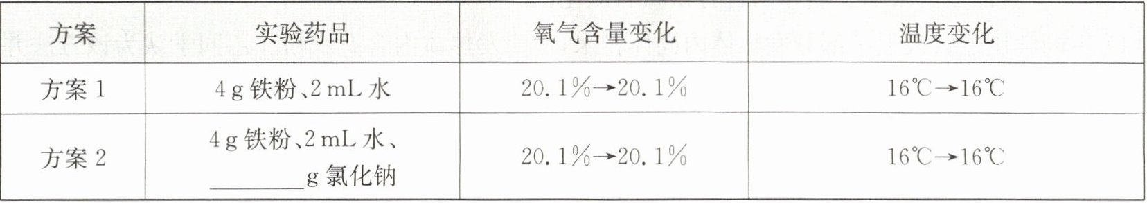 方案 2 中应取用氯化钠的质量是______g。方案 4 中温度迅速上升的原因是氧气、铁粉与______共同作用的结果。