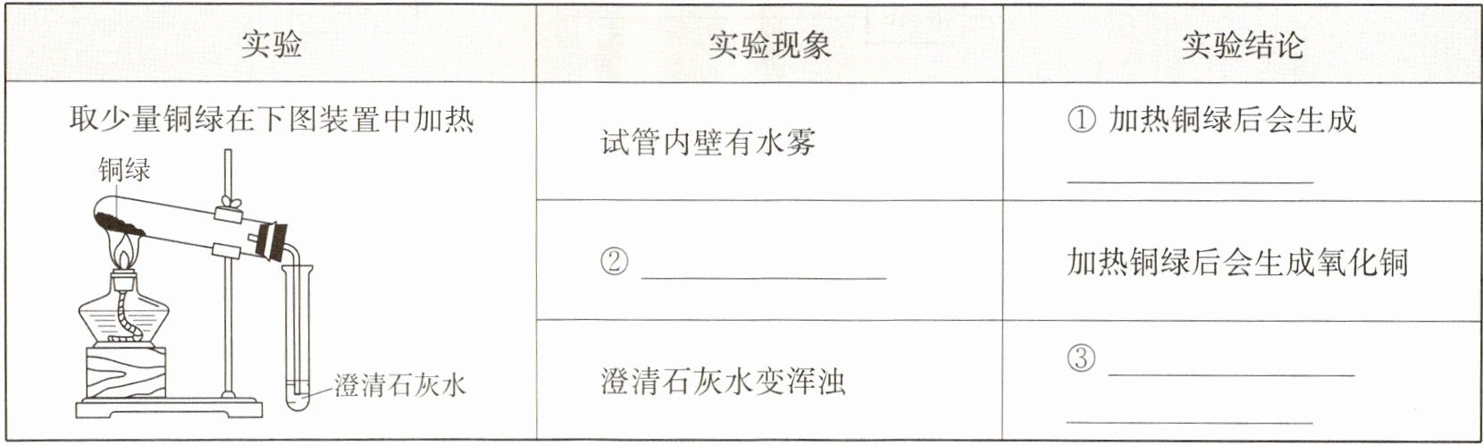 (4) 兴趣小组的同学发现实验室一片久置的铜片表面附着有一层铜绿。甲同学从铜片上刮下一些铜绿进行如下探究,请帮助他补全下表。