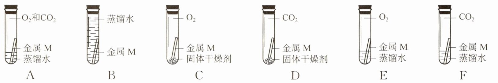9. 化学兴趣小组的同学发现长期露置在空气中的金属 M 表面会被锈蚀,于是他们一起探究金属 M 锈蚀的原因。经检测,锈蚀产物中除含有 M 元素外,还含有碳、氢、氧三种元素。他们想找到与金属 M 发生反应生成锈蚀产物的物质,请回答。