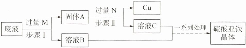 7. 为减少污染并促进资源再利用,小组同学又设计了从废液(含有硫酸亚铁、硫酸铜和硫酸)中回收硫酸亚铁和金属铜的实验方案,以下对该流程的分析正确的是(