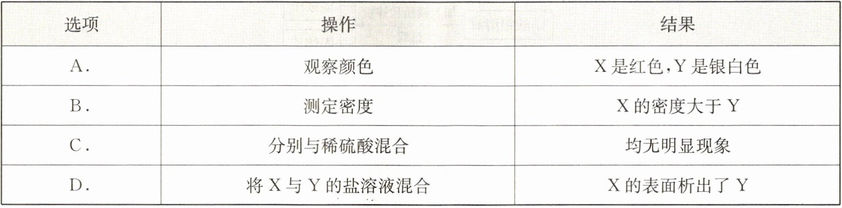 11. 为探究$X$、$Y$两种金属的活动性强弱,取$X$、$Y$进行实验。下列能达成实验目的的是(