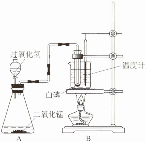 (2)当烧杯内的水受热,温度计显示$25^{\circ}C$时,打开分液漏斗的活塞,盛有水的试管中有气泡均匀逸出,白磷未燃烧,关闭活塞。锥形瓶内反应的化学方程式是______。白磷与氧气接触,但未燃烧的原因是______。