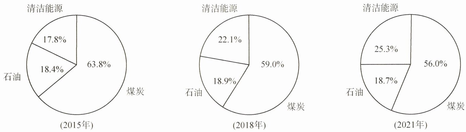 5. 我国 2015 年、2018 年和 2021 年的能源结构图如下,下列说法中错误的是(
