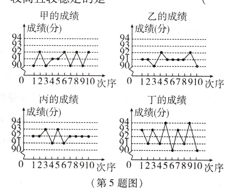 5. 甲、乙、丙、丁四人 10 次随堂测验的成绩如图所示,从图中可以看出这 10 次测验平均成绩较高且较稳定的是 (
