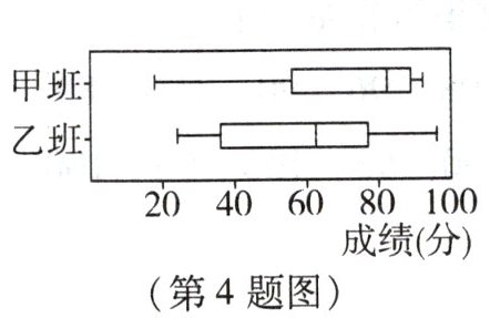 4. 甲、乙两班的学生人数相同,如图为两班某次数学小考成绩的箱线图,若甲、乙两班学生小考成绩的中位数分别为a,b;甲、乙两班中小考成绩超过80分的学生人数分别为c,d,则下列关于a,b,c,d的大小关系正确的是(