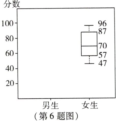 6. 某班男、女生各有24人,一次英语测试女生成绩的箱线图如图所示,男生的成绩(单位:分)如下:38,42,45,50,55,58,62,63,68,70,72,75,77,78,82,85,88,90,92,94,96,98,100,100.