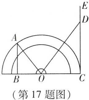 17. (7 分)(新考法·跨物理学科)小丽在物理实验课上利用如图所示“光的反射演示器”直观呈现了光的反射原理. 她用激光笔从量角器左边边缘点 $ A $ 处发出光线,经量角器圆心 $ O $ 处(此处放置平面镜)反射后,反射光线落在右边光屏 $ CE $ 上的点 $ D $ 处($ C $ 也在量角器的边缘上,$ O $ 为量角器的中心,$ C $,$ O $,$ B $ 三点共线,$ AB \perp BC $,$ CE \perp BC $). 小丽在实验中还记录下了 $ AB = 6 $cm,$ BC = 12 $cm. 依据记录的数据,求量角器的半径 $ OC $ 长.
