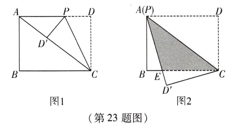 23. (13 分)数学兴趣小组探究勾股定理在折叠中的应用. 已知长方形纸片 $ ABCD $,$ AD = 4 $,$ DC = 3 $,$ P $ 为长方形纸片 $ ABCD $ 边 $ AD $ 上一动点,连接 $ CP $,将 $ \triangle CDP $ 沿 $ CP $ 折叠,点 $ D $ 落在点 $ D' $ 处.