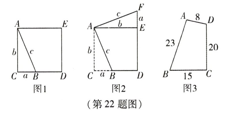 22. (12 分)公元 3 世纪,古人就通过拼图验证了勾股定理:在直角三角形中两直角边 $ a $,$ b $ 与斜边 $ c $ 满足关系式 $ a^2 + b^2 = c^2 $. 还探索验证了勾股定理的逆定理:如果三角形三边满足 $ a^2 + b^2 = c^2 $,则这个三角形是直角三角形.
