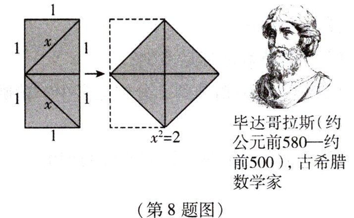8. 公元前 6 世纪古希腊的毕达哥拉斯学派认为“万物皆数”,意思是一切量都可以用整数或整数的比(分数)表示.后来,这一学派的希帕索斯发现,边长为 1 的正方形的对角线的长度不能用整数或整数的比表示(如图),由此引发了第一次数学危机.这里“不能用整数或整数的比表示的数”是指(