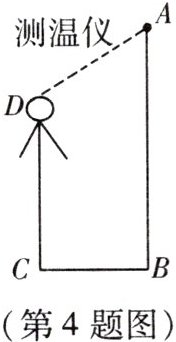 4. 某医院门诊入口的正上方$A$处装有红外线激光测温仪(如图所示),测温仪离地面的距离$AB为2.4m$,当人体进入感应范围内时,测温仪就会自动测温并报告人体体温。当身高为$1.8m的市民CD正对门缓慢走到离门0.8m$的地方时(即测温仪自动显示体温),则人头顶与测温仪的距离$AD$为