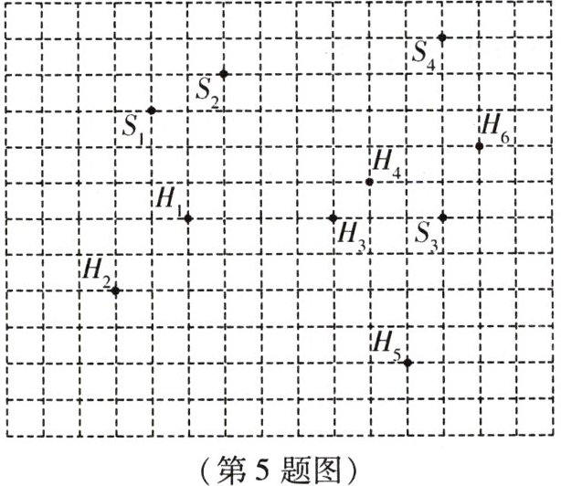 5. 园林部门为了对市内某旅游景区内的古树名木进行系统养护,建立了相关的地理信息系统,其中一项工作就是要确定这些古树的位置。已知该旅游景区有树龄百年以上的古松树4棵$(S_{1},S_{2},S_{3},S_{4})$、古槐树6棵$(H_{1},H_{2},H_{3},H_{4},H_{5},H_{6})$。为了加强对这些古树的保护,园林部门根据该旅游景区地图,将4棵古松树的位置用坐标表示为$S_{1}(-4,3)$,$S_{2}(-2,4)$,$S_{3}(4,0)$,$S_{4}(4,5)$。