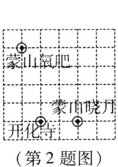 2. (新考法·数学文化)“计里画方”是中国古代一种按比例尺绘制地图的传统方法,绘图时先在图上布满方格,然后按方格绘制地图内容。小华按照“计里画方”的方法,绘制了蒙山大佛旅游区的局部示意图(如图)。若该图中“开化寺”与“蒙山晓月”两处景点的坐标分别为$(-1,-2)$,$(1,-2)$,则景点“蒙山氧吧”的坐标为(