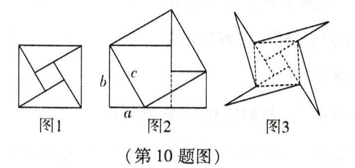 10.【感知】“赵爽弦图”巧妙地利用面积关系验证了勾股定理,是我国古代数学的骄傲,如图1所示的“赵爽弦图”是由四个全等的直角三角形和一个小正方形拼成的一个大正方形,设直角三角形较长直角边长为$b$,较短直角边长为$a$,斜边长为$c$,若$(a + b)^{2}= 21$,大正方形的面积为$13$,求小正方形的面积。
