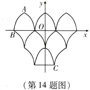 14. (新考法·传统文化)窗格是中国传统建筑装饰的重要构成因素,是中国传统建筑文化的重要组成部分. 如图是部分窗格截面示意图,将其放置在平面直角坐标系中,点$A$,$B$,$C$均为弧的端点. 若点$A的坐标为(-2,\sqrt{3})$,点$B的坐标为(-3,0)$,则点$C$的坐标为