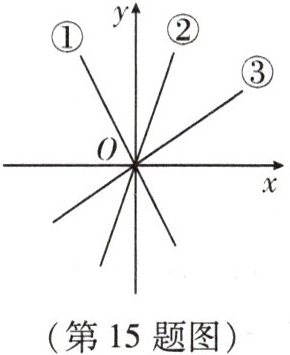 15. 如图,三个正比例函数的图象分别对应表达式:① $ y = ax $,② $ y = bx $,③ $ y = cx $,将 $ a $,$ b $,$ c $ 按从小到大的顺序排列为