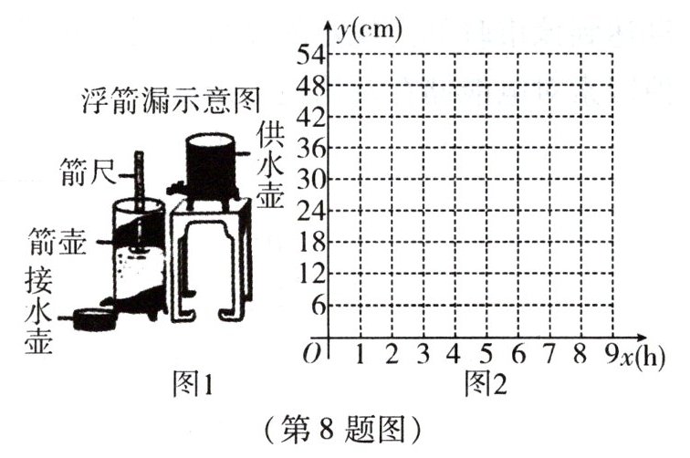 8. (新考法·数学文化)《九章算术》中记载,浮箭漏 (图 1) 出现于汉武帝时期,它由供水壶和箭壶组成,箭壶内装有箭尺,水匀速地从供水壶流到箭壶,箭壶中的水位逐渐上升,箭尺匀速上浮,可通过读取箭尺读数计算时间.某学校 STEAM 小组仿制了一套浮箭漏,并从函数角度进行了如下实验探究: