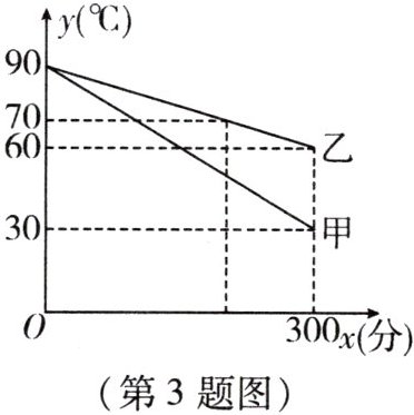 3. 小明和爸爸各买了一个保温壶,分别记为甲和乙. 小明对这两个保温壶进行了保温测试,他同时分别向甲、乙两个保温壶中倒入了同样多$90^{\circ }C$的热水,经过一段时间的测试发现:乙的保温性能更好,且这段时间内,甲、乙的水温$y$(单位:$^{\circ }C$)与时间$x$(单位:分)之间都近似地满足一次函数关系,其函数图象如图所示. 根据相关信息,解答下列问题: