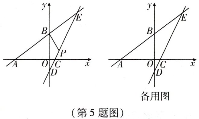 5. 如图,在平面直角坐标系中,一次函数 $y = \frac{3}{4}x + 12$ 的图象分别交 $x$ 轴、$y$ 轴于点 $A$ 和 $B$,与经过点 $C(\frac{3}{2},0)$,$D(0,-3)$ 的直线交于点 $E$。