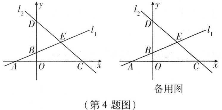 4. 如图,直线 $l_{1}$ 与 $x$ 轴、$y$ 轴分别交于点 $A$,$B(0,1)$,直线 $l_{2}:y = -x + 4$ 与 $x$ 轴、$y$ 轴分别交于点 $C$,$D$,直线 $l_{1}$ 与 $l_{2}$ 交于点 $E(2,m)$。