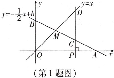 1. 如图,一次函数$y= -\frac {1}{2}x+b$的图象与x轴、y轴分别交于点A,B,与正比例函数$y= x$的图象交于点M,点M的横坐标为2,在x轴上有一点$P(a,0)$(其中$a>2$),过点P作x轴的垂线,分别交一次函数$y= -\frac {1}{2}x+b和正比例函数y= x$的图象于点C,D.