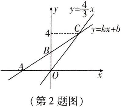 2. 如图,在平面直角坐标系xOy中,一次函数$y= kx+b$的图象与x轴交于点A,与y轴交于点$B(0,2)$,且与正比例函数$y= \frac {4}{3}x的图象的交点为C(m,4)$.