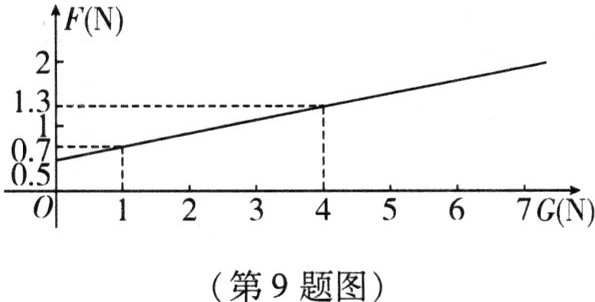 9. 在物理实验课上,小鹏利用滑轮组及相关器材进行实验,他把得到的拉力 F(单位:N)和所悬挂物体的重力 G(单位:N)的几组数据用电脑绘制成如图所示的图象(不计绳重和摩擦),则下面结论不正确的是(