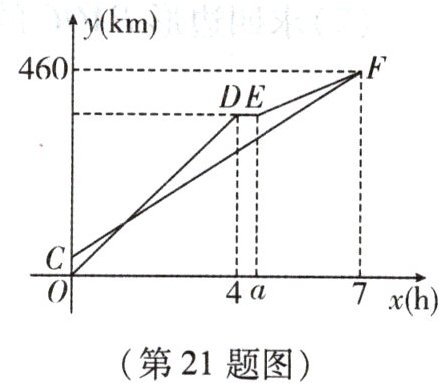21. (10 分)辽宁滨海大道是中国最长的沿海公路,全长 1443 公里. 甲、乙两车从辽宁滨海大道的 A 地出发,沿同一路线驶向 B 地,甲车先出发匀速驶向 B 地,40min 后,乙车出发,匀速行驶一段时间后,在途中的货站装货耗时半小时. 由于满载货物,为了行驶安全,速度减少了 50km/h,结果与甲车同时到达 B 地,甲、乙两车距 A 地的路程 y(单位:km)与乙车行驶时间 x(单位:h)之间的函数图象如图所示.