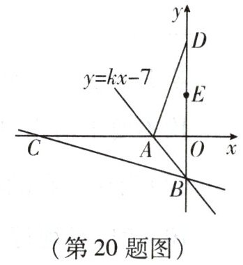20. (8 分)(新考法·新定义阅读)将平面直角坐标系中一次函数的图象与坐标轴围成的三角形,叫作此一次函数的坐标三角形(也称为直线的坐标三角形). 如图,一次函数$y = kx - 7$的图象与 x 轴、y 轴分别交于点 A,B,那么$\triangle ABO$为此一次函数的坐标三角形(也称为直线 AB 的坐标三角形).