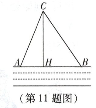 11. 如图,在一条东西走向的河流的一侧有一村庄 $C$,河边原有两个取水点 $A$,$B$,其中 $AB = AC$,由于某种原因,由 $C$ 到 $A$ 的路现在已经不通,该村为方便村民取水,决定在河边新建一个取水点 $H$($A$,$H$,$B$ 在同一条直线上),并新建一条路 $CH$,测得 $CB = 1.5\mathrm{km}$,$CH = 1.2\mathrm{km}$,$HB = 0.9\mathrm{km}$。