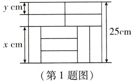 1. 如图,用10个形状、大小完全相同的小长方形拼成一个大长方形,设每个小长方形的长和宽分别为$x$cm和$y$cm,则可列方程组为(