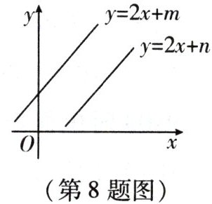 8. 已知一次函数$y = 2x + m与y = 2x + n(m \neq n)$的图象如图所示,则关于$x与y的二元一次方程组\begin{cases}2x - y = -m,\\2x - y = -n\end{cases} $的解有(