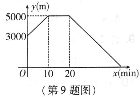 9. 小刚家、学校、图书馆依次在同一条直线上,小刚骑自行车匀速从学校到图书馆,到达图书馆还完书后,再以相同的速度原路返回家中(上、下车时间忽略不计). 小刚离家的距离 $ y(\mathrm{m}) $ 与他所用的时间 $ x(\mathrm{min}) $ 的函数关系如图所示.