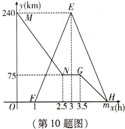 10. 已知 $ A $,$ B $ 两地相距 $ 240 \mathrm{km} $,一辆货车从 $ A $ 地前往 $ B $ 地,途中因装载货物停留一段时间. 一辆轿车沿同一条公路从 $ B $ 地前往 $ A $ 地,到达 $ A $ 地后(在 $ A $ 地停留时间不计)立即原路原速返回. 如图是两车距 $ B $ 地的距离 $ y(\mathrm{km}) $ 与货车行驶时间 $ x(\mathrm{h}) $ 之间的函数图象,结合图象回答下列问题: