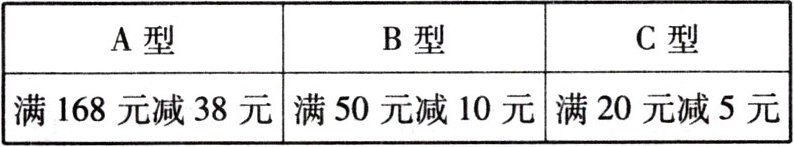 已知$A$型消费券每张减$38$元,$B$型消费券每张减$10$元,$C$型消费券每张减$5$元。