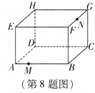 8. 如图是放在地面上的一个长方体盒子,其中AB = 18cm,BC = 12cm,BF = 10cm,点M在棱AB上,且AM = 6cm,N是FG的中点,一只蚂蚁要沿着长方体盒子的表面从点M爬行到点N,它需要爬行的最短路程是多少?