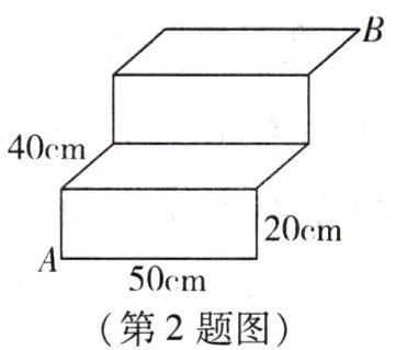 2. 如图是一个台阶示意图,每一层台阶的高都是20cm,宽都是50cm,长都是40cm,一只蚂蚁沿台阶从点A出发到点B,其爬行的最短线路的长度是 (