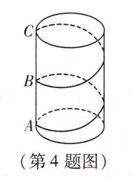 4. (辽阳期末)如图,有一个圆柱体礼盒,高24cm,底面周长为16cm. 现准备在礼盒表面粘贴彩带作为装饰,若彩带一端粘在A处,另一端绕礼盒侧面2周后粘贴在C处(B为AC的中点),则彩带最短为