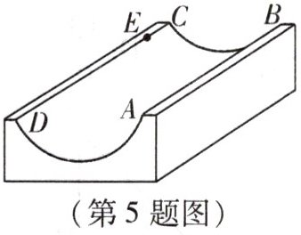 5. 如图是某单板滑雪U形池的示意图,该U形池可以看作是一个长方体去掉一个“半圆柱”而成,中间可供滑行的部分的截面是半径为$\frac{45}{\pi}m$的半圆,其边缘AB = CD = 120m. 一名冰雪爱好者要在CD上选取一点E,能够使他从点A滑到点E再滑到点B的滑行距离最短,则他滑行的最短距离为