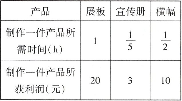 (1)若制作三种产品共计需要$25h$,所获利润为450元,求制作展板、宣传册和横幅的数量;