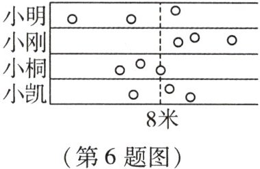6. 小明、小刚、小桐和小凯比赛谁投球比较远,每人投3次,结果如图所示.这四名同学中,投球的平均成绩大约是8米的是(