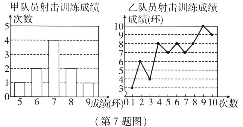 7. 甲、乙两名队员参加射击训练,成绩分别被制作成下面两个统计图: